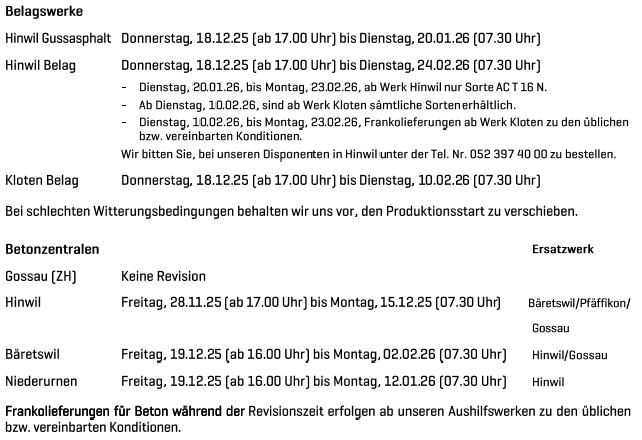 Aktuelles Werksrevisionen Belag + Beton Infolge Revisionsarbeiten und Feiertagen sind unsere Werke während folgenden Daten geschlossen:
